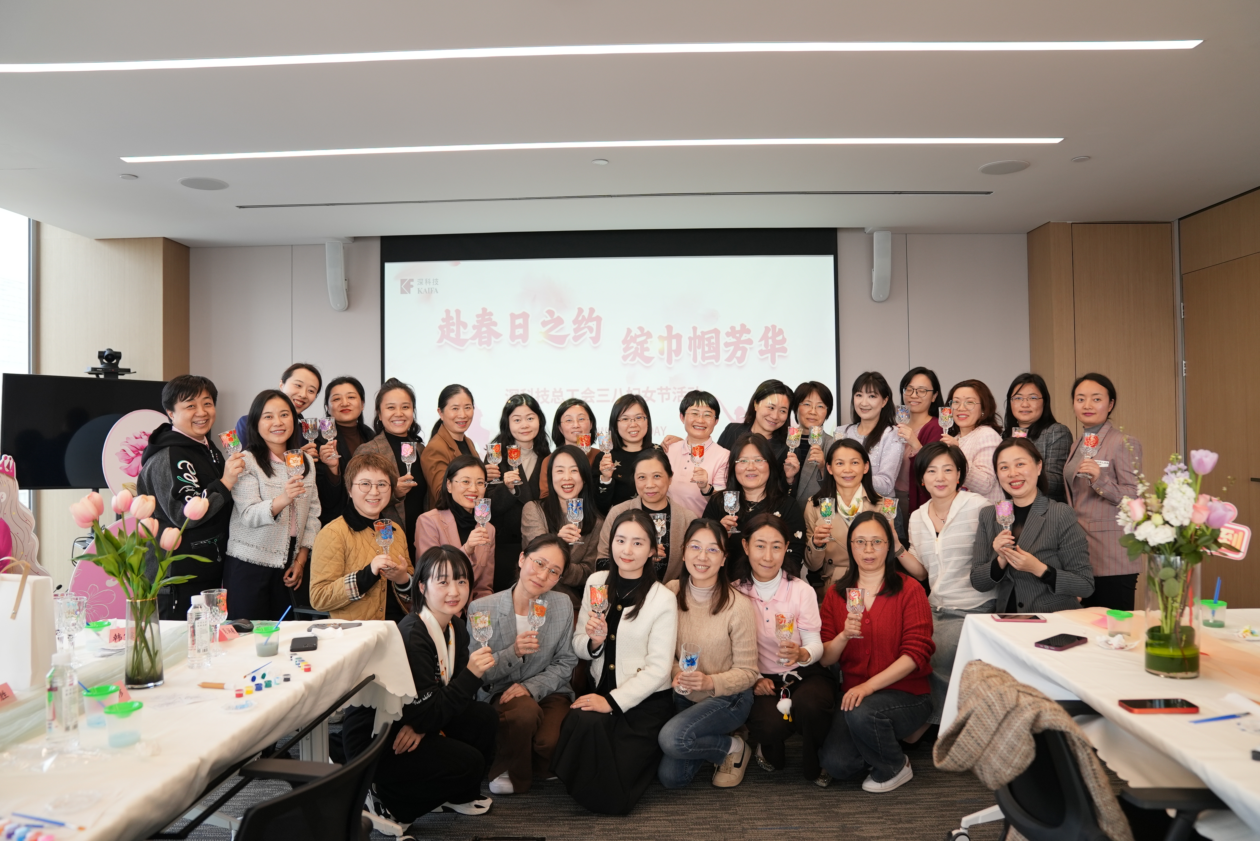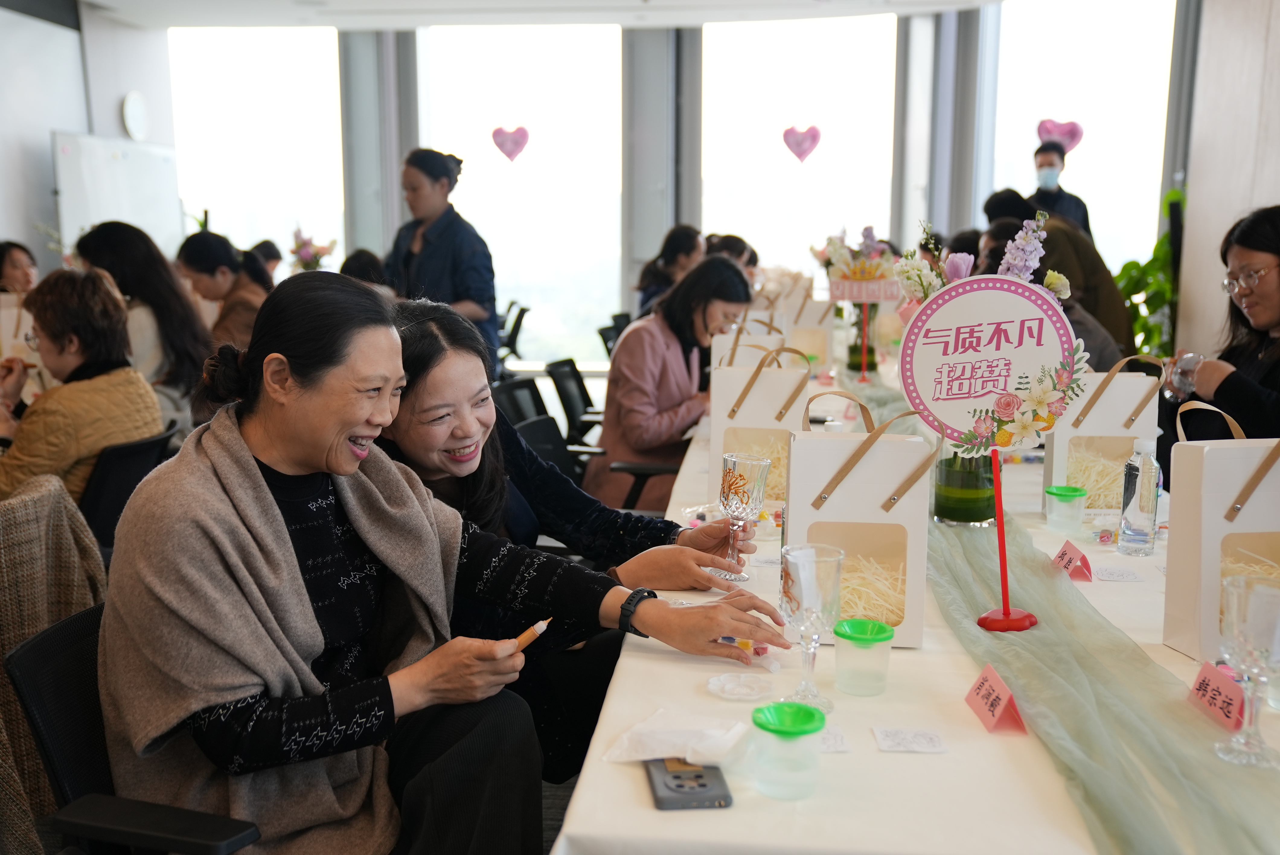 “手绘春天 温馨加‘杯’” 手工沙龙活动吸引了众多女神们的参与。公司党委书记、董事长韩宗远,监事会主席肖涧毅,董事会秘书钟彦,工会副主席邱胜及来自各部门的管理人员和职工近五十人参加活动。