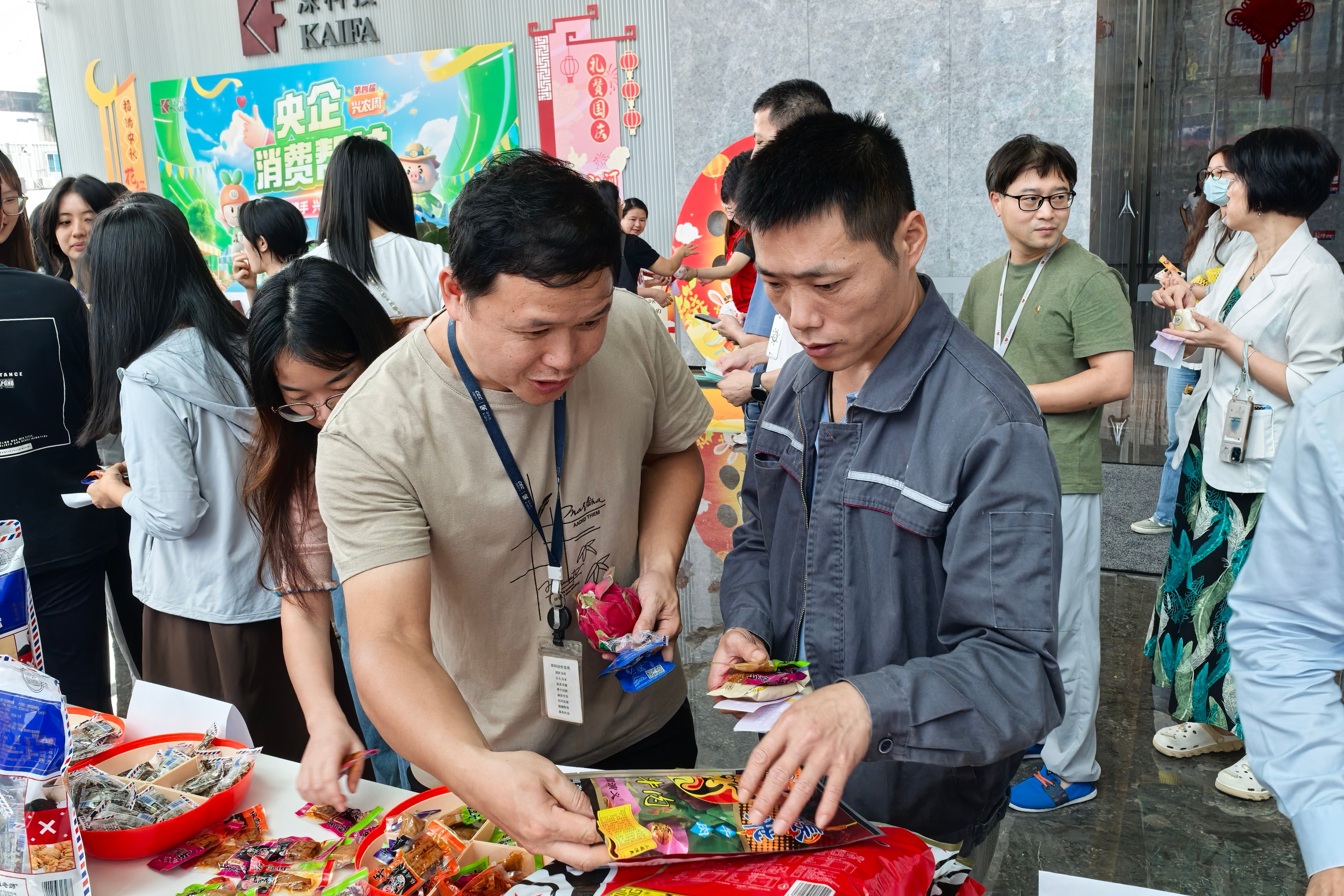 活动现场,来自集团公司对口帮扶县——陕西镇安、四川阆中、海南临高等地的特色农副产品与休闲食品跨越山海,精彩呈现。甘栗仁、张飞什锦牛肉、苦荞酥、黑芝麻核桃糕、红毛丹果冻等琳琅满目的美食吸引了众多员工驻足品尝。大家踊跃扫码进入“中电消费帮扶商城”平台选购产品,现场气氛热烈、暖意融融,充分展现了“人人参与帮扶、人人乐享丰收”的浓厚氛围。